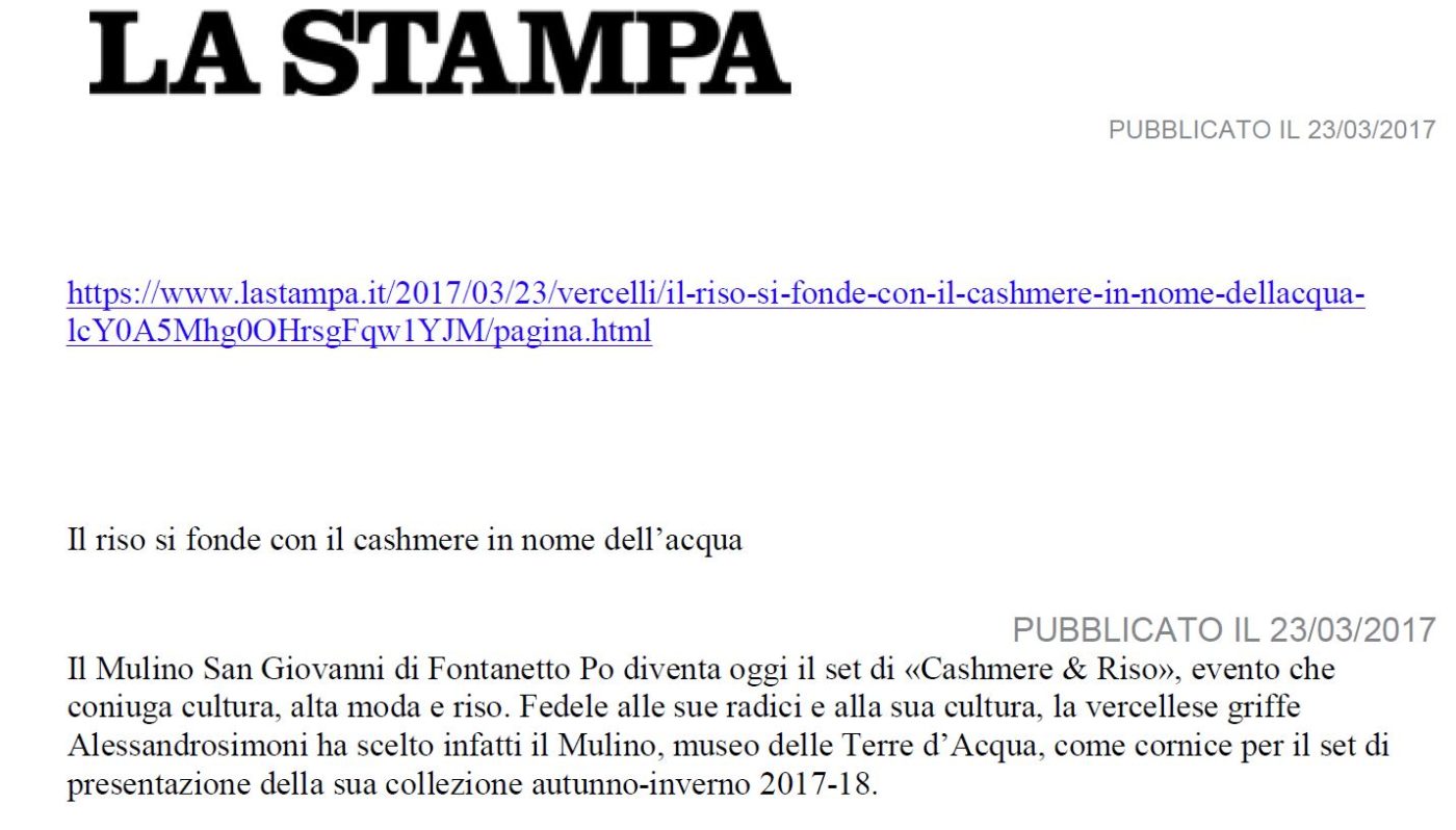 StampaIl riso si fonde con il cashmere in nome dell’acqua Pubblicato il 23 Marzo 20178 Marzo 2019 da AleSimWP2018 23 Mar Continua a leggere →